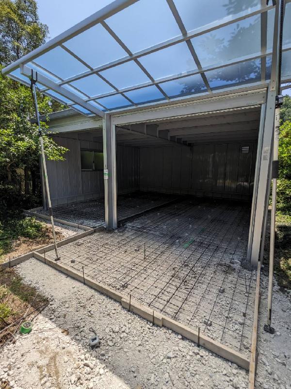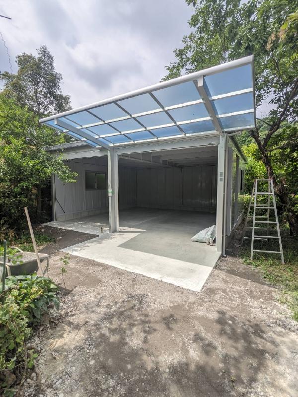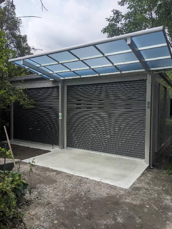 イナバガレージ ガレーディア / 三協アルミ カーポート 今回はイナバガレージ ガレーディア2連棟と三協アルミのカーポートを施工いたしました。 ガレーディアはオプションも豊富です。こちらはガラス窓や壁面扉、明かり窓付シャッター(外部からの光を取り入れるシャッターへの変更)も追加しています。 棚を追加することでガレージの一部を物置としてお使いもいただけます。 ガレージ・倉庫のご相談お待ちしております。