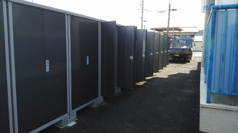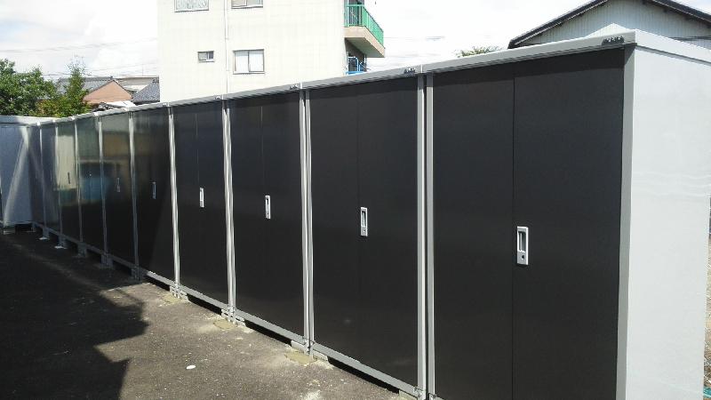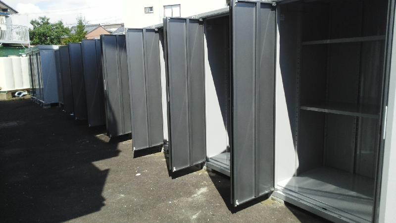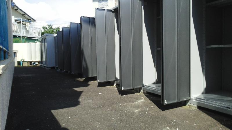 今回は連続型の物置です。 会社などで使われることが多いですが、 最近ではアパートやマンションなどで物置付きの物件も増えているようです。 冬用のタイヤを入れておいたり洗車に使う道具など 賃貸にお住いの方は保管場所に困ります。 そんなとき物置があったらとても重宝しますよね。